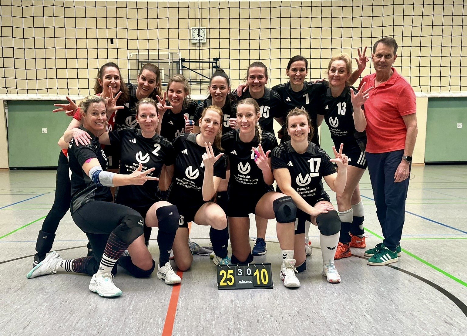Nach dem Spiel warteten alle gebannt auf die Bestätigung der Berechnungen in der Ergebnis-App. Nach 10 Minuten dann die absolute Freude: Alles richtig: Punktgleichheit und identitischer Satzquotient mit Wuppertal, aber eben ein Sieg mehr und damit den direkten Klassenerhalt auf dem allerletzten Meter noch unter Dach und Fach gebracht und die Relegation vermieden.